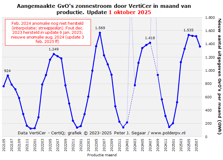 Ook zijn de verstrekte Garanties van Oorsprong voor gecertificeerde PV projecten gereconstrueerd en grafisch verbeeld over de afgelopen periode. Zowel de grote februari als de in een vorige update gemelde, en door VertiCer ook erkende grote augustus 2024 anomalie zijn nog steeds niet in de publiek toegankelijke data hersteld. Voor augustus 2025 is een voorlopig record niveau voor de eerst bekende maandproductie geregistreerd van 1,36 terawattuur, wat ongetwijfeld nog flink opwaarts bijgesteld zal gaan worden in latere updates. Het is een kwart meer productie dan 2 jaar eerder, voor augustus 2024 is nog steeds geen correcte waarde voorhanden (momenteel nog steeds, onverklaarbaar, extreem hoog).