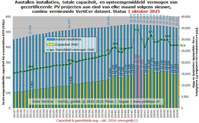 In deze grafiek, met de meest recente actuele en gewijzigde data uit de september 2025 rapportage van VertiCer, en deels oudere data uit de CertiQ updates, de stand van zaken vanaf juli 2021 tm. september 2025. De blauwe kolommen geven de ontwikkeling van de aantallen installaties weer (ref.: rechter Y-as), voorlopig culminerend in 35.011 exemplaren, begin oktober 2025. Wat, wederom, een netto negatieve groei weergeeft van 214 projecten** t.o.v. de status, eind augustus 2025 (gereviseerd, 35.225 exemplaren), en wat zelfs al 1.532 exemplaren (4,2%) minder is dan het tot nog toe hoogste niveau (36.543 in, inmiddels, juli 2024, gereviseerd).