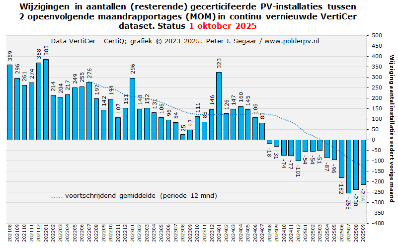 Februari tot en met april 2025 deden het marginaal beter, met 16.225, 17.235, resp. 17.329 nieuwe installaties, met een gezamenlijke AC capaciteit van 84,8, 92,1, resp. 91,9 MWac. Resulterend in gemiddeld vermogens van 5,22, 5,35, resp. 5,30 kWac per nieuwe installatie. In mei werd een nieuw dieptepunt bereikt, met nog maar 12.565 nieuwe registraties, resp. 67,2 MWac, en een gemiddeld vermogen van 5,35 kWac. De daarop volgende vakantie maanden juni tm. augustus voegden 88,2, 78,9, resp. een nieuw dieptepunt, 59,7 MWac toe, en 14.280, 13.565, resp., wederom het laagste niveau, 10.109 nieuwe registraties. Het gemiddelde per nieuwe registratie, opvallend hoog in juni (6,18 kWac), viel in juli tm. september weer terug naar 5,82, resp. 5,91 en 5,85 kWac per nieuwe registratie. Het niveau lag in september 2025, wat de aantallen registraties betreft, op een zwaar tegenvallende 41% t.o.v. de hoeveelheid in september 2024, wat zelf al 62% minder was dan het nieuwe volume in september van het recordjaar 2023.