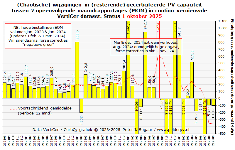 Terugkerend in de analyses van Polder PV blijft de observatie dat er regelmatig "onwaarschijnlijke", dan wel "inconsistente" cijfers in de actuele data van VertiCer zijn terug te vinden. Dit is deels het gevolg van het feit dat het bij maandelijkse verschillen altijd om netto effecten van zowel instroom als uitstroom van projecten gaat, een toenemend aantal uitschrijvingen van meestal kleinere installaties actueel is, en, tegelijkertijd, steeds groter wordende nieuwe projecten bij de inschrijvingen. Daarnaast kunnen, vanwege wel toegezegde, maar nog steeds ontbrekende uitgangs- en ingangs-controles, al meermalen door Polder PV aangetoonde foute data entries van netbeheerders, ongecorrigeerd in de databank belanden, die pas na een lange periode zouden (kunnen) worden hersteld, etc. Het maakt het er allemaal niet overzichtelijk op. En leidt regelmatig tot zeer verwarrende cijfers.