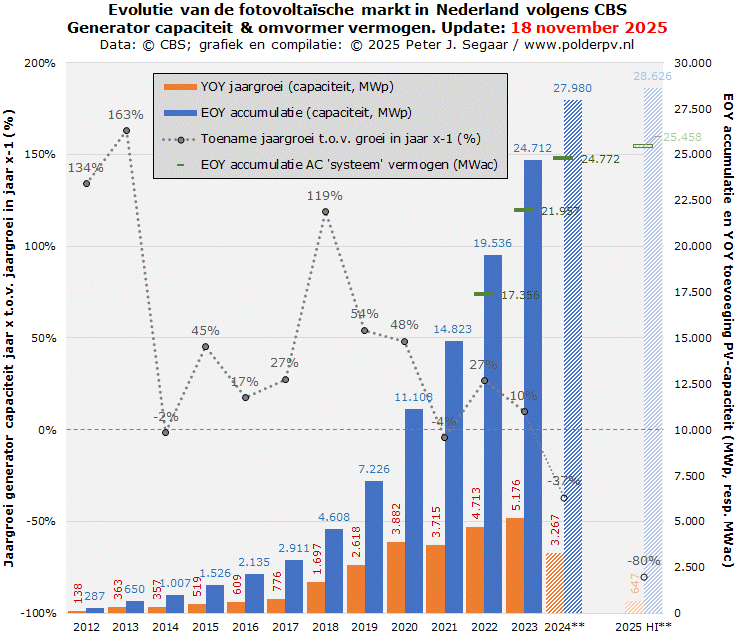 Voor de jaren 2023 en 2024 zijn tevens de geschatte AC vermogens inmiddels gewijzigd. Bovendien zijn nu de aller-eerste data voor medio 2025 (eind 2e kwartaal) bekend gemaakt. Er zouden eind juni 2025 3,24 miljoen PV installaties zijn geaccumuleerd, met een gezamenlijk vermogen van 28.626 MWp. Dat is slechts 647 MWp meer dan eind 2024, wat beslist een forse verdere markt-afkoeling weergeeft. Maar niet vergeten moet worden dat dit soort eerste cijfers later zeer fors worden bijgesteld in volgende CBS updates, zoals de flink fluctuerende cijfers voor 2024 alweer hebben laten zien.