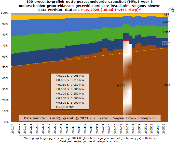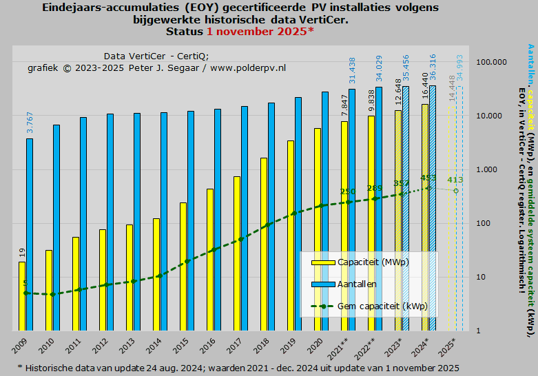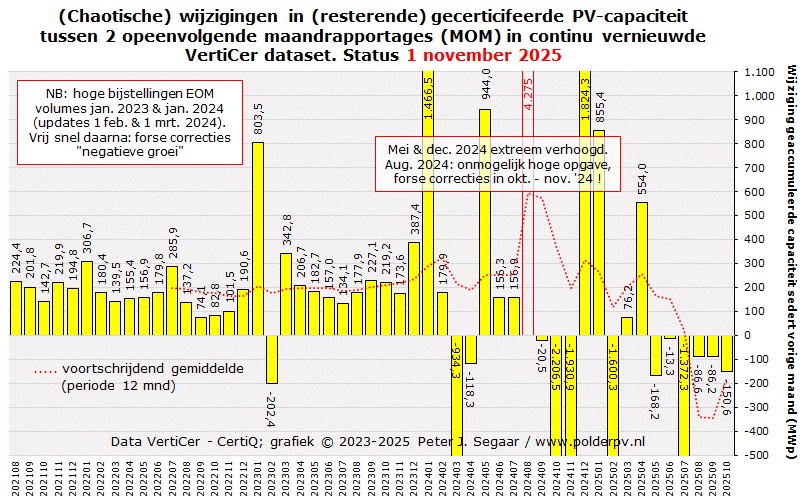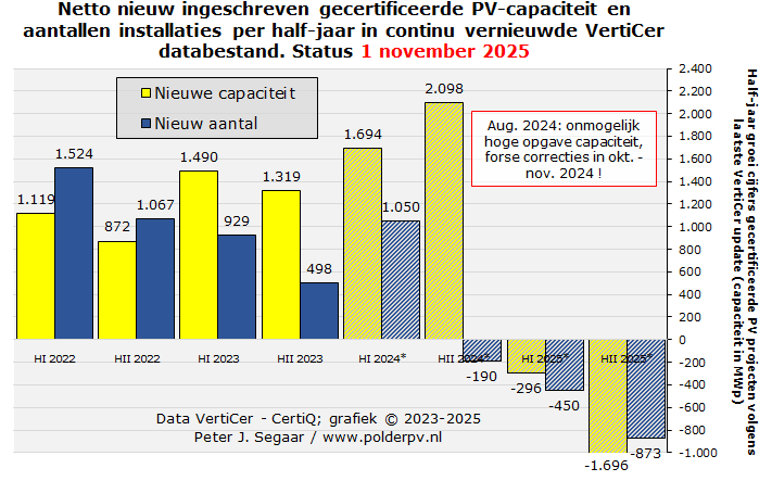 Februari tot en met april 2025 deden het marginaal beter, met 16.225, 17.235, resp. 17.329 nieuwe installaties, met een gezamenlijke AC capaciteit van 84,8, 92,1, resp. 91,9 MWac. Resulterend in gemiddeld vermogens van 5,22, 5,35, resp. 5,30 kWac per nieuwe installatie. In mei werd een nieuw dieptepunt bereikt, met nog maar 12.565 nieuwe registraties, resp. 67,2 MWac, en een gemiddeld vermogen van 5,35 kWac. De daarop volgende vakantie maanden juni tm. augustus voegden 88,2, 78,9, resp. een nieuw dieptepunt, 59,7 MWac toe, en 14.280, 13.565, resp., wederom het laagste niveau, 10.109 nieuwe registraties. Het gemiddelde per nieuwe registratie, opvallend hoog in juni (6,18 kWac), viel in juli tm. oktober weer terug naar 5,82, 5,91, 5,85, resp. 5,42 kWac per nieuwe registratie. Het niveau lag in oktober 2025, wat de aantallen registraties betreft, op een zwaar tegenvallende 55% t.o.v. de hoeveelheid in oktober 2024, wat zelf al 51% minder was dan het nieuwe volume in oktober van het recordjaar 2023.