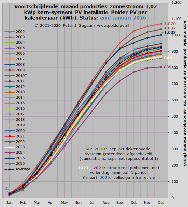 In deze analyse de cijfers voor januari 2026, voor het referentie systeem bij Polder PV. Wat sedert de netkoppeling van de eerste vier zonnepanelen, op 13 maart 2000, in de basis, begin januari 2026, inmiddels 9.456 dagen in bedrijf is. Voor een verslagje van de systeemrevisie op 8 maart, bij het eerste kwart eeuw jubileum, 13 maart 2025, zie hier. De in een eerdere rapportage uitgesproken hoop dat "alles weer normaal" zou worden in 2025, als gevolg van die systeem renovatie, blijkt met de cijfers voor april tot en met december volledig te zijn uitgekomen. En zelfs tot de derde beste jaarproductie ooit te hebben geleid, dat jaar.