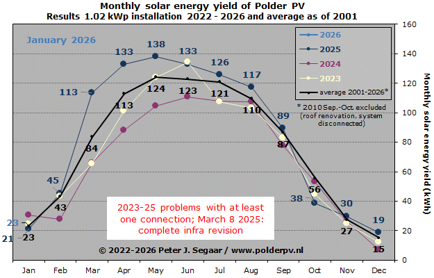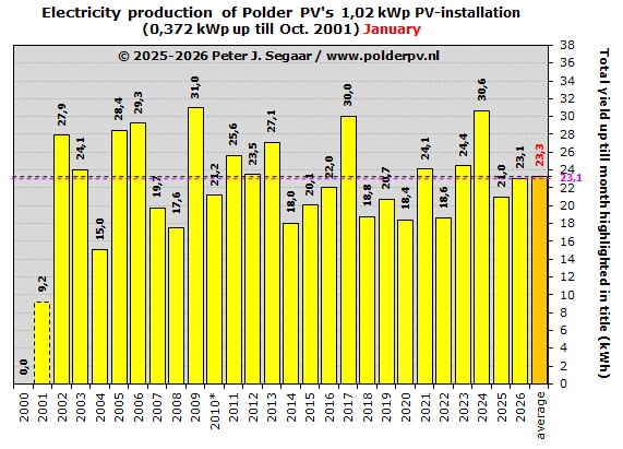 Januari 2026 komt, met een productie van 23,1 kWh, minder dan 1% onder het langjarige gemiddelde (23,2 kWh) voor die maand uit. En is daarmee een goede representant van de haalbare gemiddelde opbrengst in die maand. 12 maanden gave mindere producties te zien, en weer 12 andere januari maanden hogere uitkomsten. Recordhouder is januari 2009, toen bijna 31,0 kWh productie werd genoteerd. KNMI kwalificeerde die maand dan ook als "Koud, zeer zonnig en gemiddeld over het land droog", met 95 t.o.v. de voor dat jaar geldende normaal van 52 zonuren. In januari 2004 werd het slechtste maandresultaat voor januari bereikt, 15,0 kWh, mogelijk vanwege tijdelijke sneeuw bedekking in die maand.