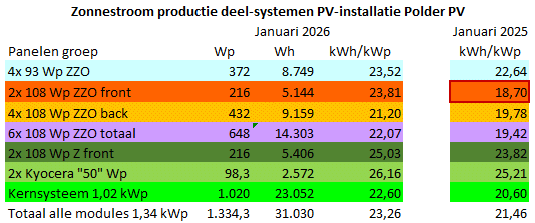 De tabel met de gemeten / deels geïnterpoleerde producties van de verschillende "sets" zonnepanelen van Polder PV, voor januari 2026, in vergelijking met de (specifieke) opbrengst in januari 2025, helemaal rechts. Naast het opgestelde vermogen in Wp wordt de productie per groep in Wattuur (Wh) vermeld, ernaast de belangrijke afgeleide specifieke opbrengst (in kWh/kWp, hetzelfde als Wh/Wp), waarmee de uit verschillende vermogens bestaande deelgroepjes goed vergeleken kunnen worden. Helemaal rechts de specifieke opbrengst in januari 2025, ontleend aan het bericht over die maand, op de Polder PV website. De productie viel toen nog, mede vanwege de forse infra problemen die al langer in 2023-2024 speelden, tegen. Die situatie is, net als in april tm. december 2025, volledig gewijzigd. Alle producie resultaten liggen weer redelijk dicht bij elkaar (kWh/kWp). Alleen de productie van de 4 panelen in de achterste rij zijn wat lager, wat "normaal" is, omdat ze bij zonnige dagen in deze wintermaand door de ervoor staande panelen op het platte dak deels / partieel worden beschaduwd.